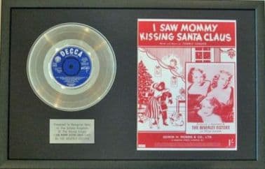 I SAW MOMMY KISSING SANTA CLAUS By THE BEVERLEY SISTERS This original vinyl 7" disc is professionally mounted on a black background and framed in a quality black ash frame size 20" x 12.5" (50cmz x 32cms)