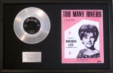 TOO MANY RIVERS By BRENDA LEE This original vinyl 7" disc is professionally mounted on a black background and framed in a quality black ash frame size 20" x 12.5" (50cmz x 32cms)
