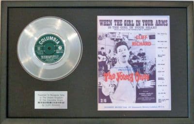 WHEN THE GIRL IN YOUR ARMS IS THE GIRL IN YOUR HEART By CLIFF RICHARD This original vinyl 7" disc is professionally mounted on a black background and framed in a quality black ash frame size 20" x 12.5" (50cmz x 32cms)
