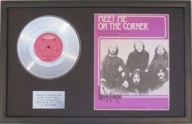 'MEET ME ON THE CORNER By LINDISFARNE This original vinyl 7" disc is professionally mounted on a black background and framed in a quality black ash frame size 20" x 12.5" (50cmz x 32cms)